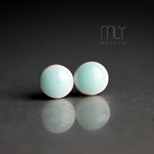Efektowne kolczyki w formie sztyftów, ręcznie wykonane z delikatnej śnieżnobiałej porcelany, jednostronnie szkliwione blado zielonym szkliwem, na antyalergicznych sztyftach w kolorze srebrnym.długość elementu ceramicznego ok 5mm, Polecam