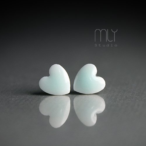 Ceramiczne kolczyki w formie sztyftów, ręcznie wykonane z delikatnej śnieżnobiałej porcelany, jednostronnie szkliwione bladozielonym szkliwem z efektem plamek i pięknym połyskiem, na antyalergicznych sztyftach w kolorze srebrnym.Średnica ok. 7mm.. Polecam