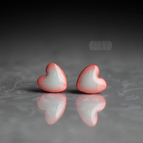 Ceramiczne kolczyki w formie sztyftów, ręcznie wykonane z delikatnej różowej porcelany, jednostronnie szkliwione bladozielonym szkliwem z efektem plamek i pięknym połyskiem, na antyalergicznych sztyftach w kolorze srebrnym.Średnica ok. 7mm.. Polecam
