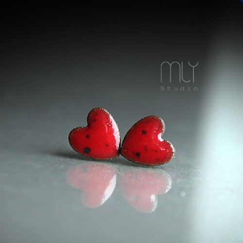 Ceramiczne kolczyki w formie sztyftów, ręcznie wykonane z delikatnej gliny kamionkowej, jednostronnie szkliwione mieszanką czerwonych szkliw z efektem plamek i subtelnym połyskiem, na antyalergicznych sztyftach w kolorze srebrnym.Średnica ok. 7mm.. Polecam . Termin realizacji zamówienia to 1-2 dni.