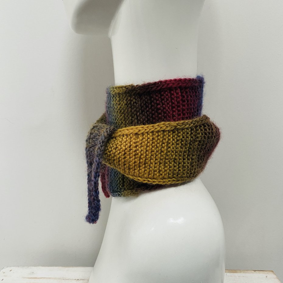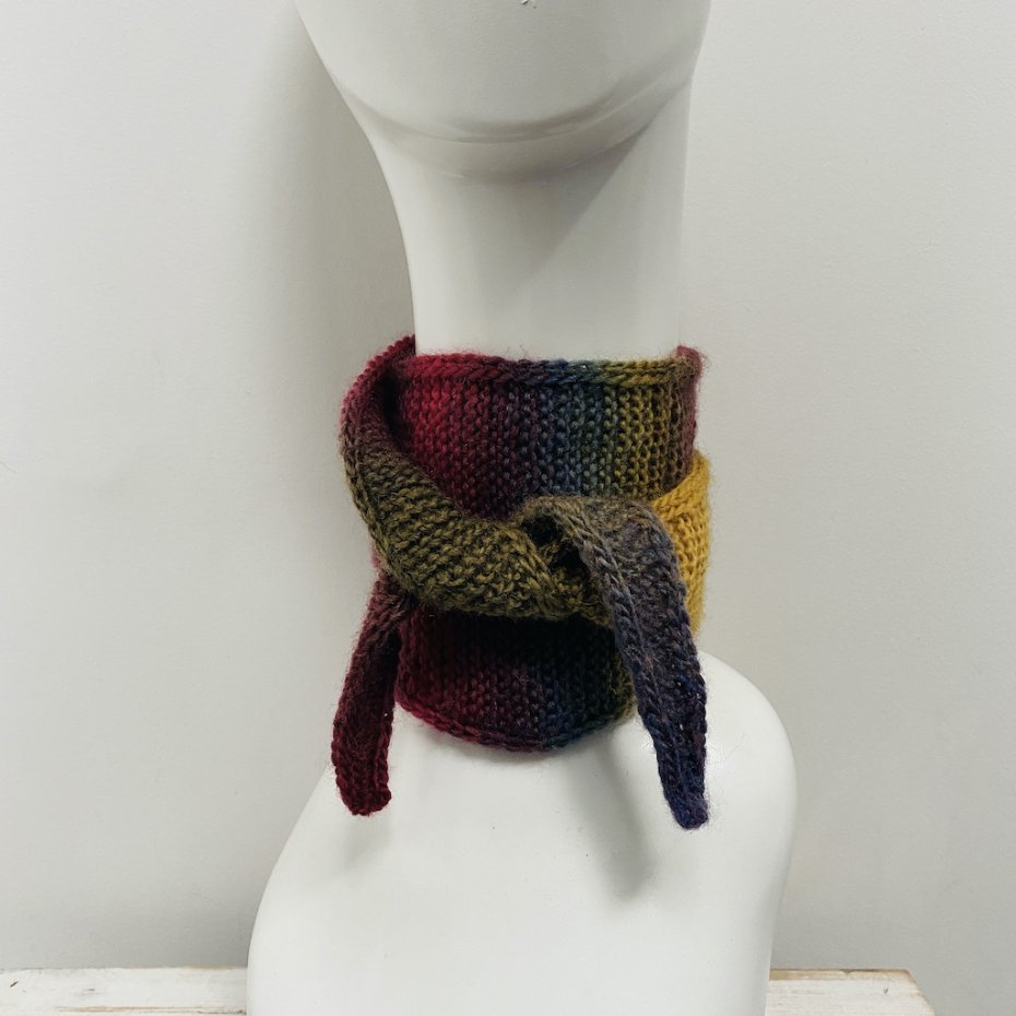 Mini szalik - apaszka wykonany w całości ręcznie na drutach z miękkiej, kolorowej, naturalnej wełny 100%, otula szyję delikatnie i komfortowo, nie gryząc i nie drażniąc skóry.