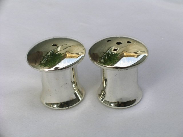 Małe urocze przyprawniki. Platerowane, z plastikowymi koreczkami od spodu. Z założenia wkładane do święconek, ale i na stołowym podorędziu w takim rozmiarze się przydadzą :) 3 x 3,2 cm. Stan zachowania dobry.