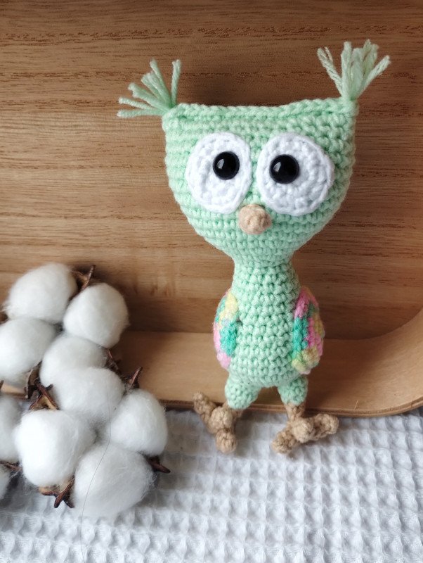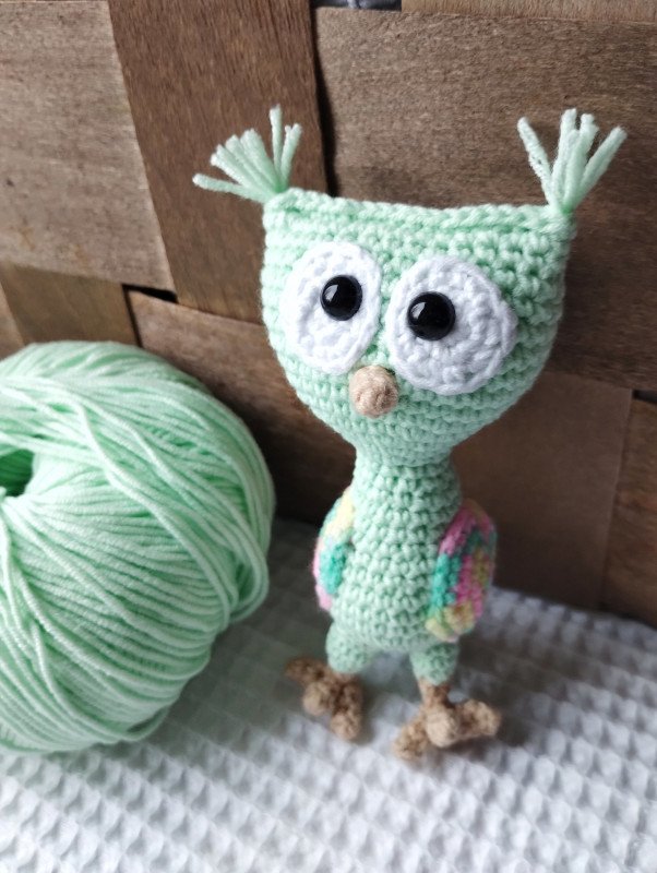 A zabawka to mini sówka. Mini, bo pochodzi z serii namniejszych dzierganych przeze mnie zabawek. Ma ok 13 cm wzrostu, wielgaśne oczy, skrzydełka i ogonek - jak na sówkę przystało. Będzie doskonałą towarzyszką każdej zabawy, a biorąc pod uwagę jej kieszonkowy rozmiar będzie mogła wyruszyć na każdą wyprawę!