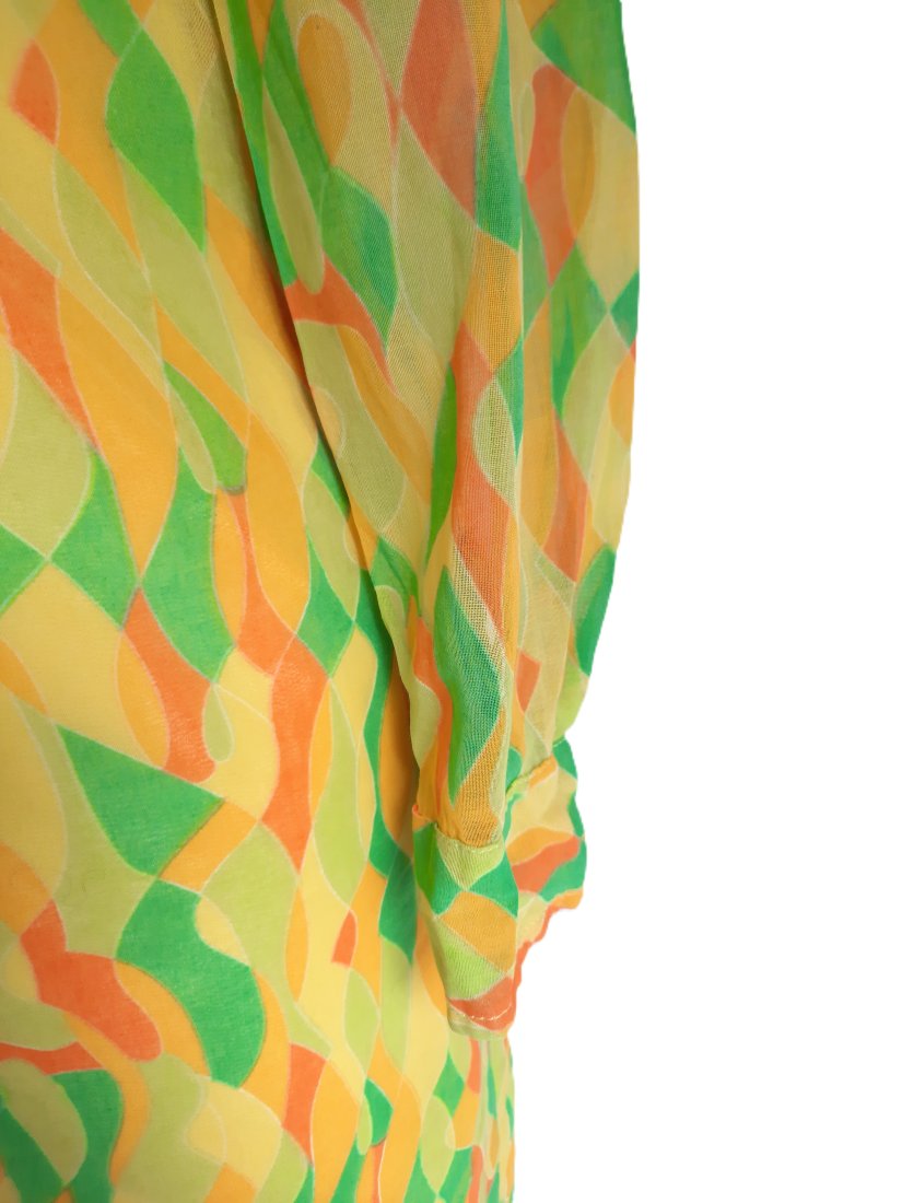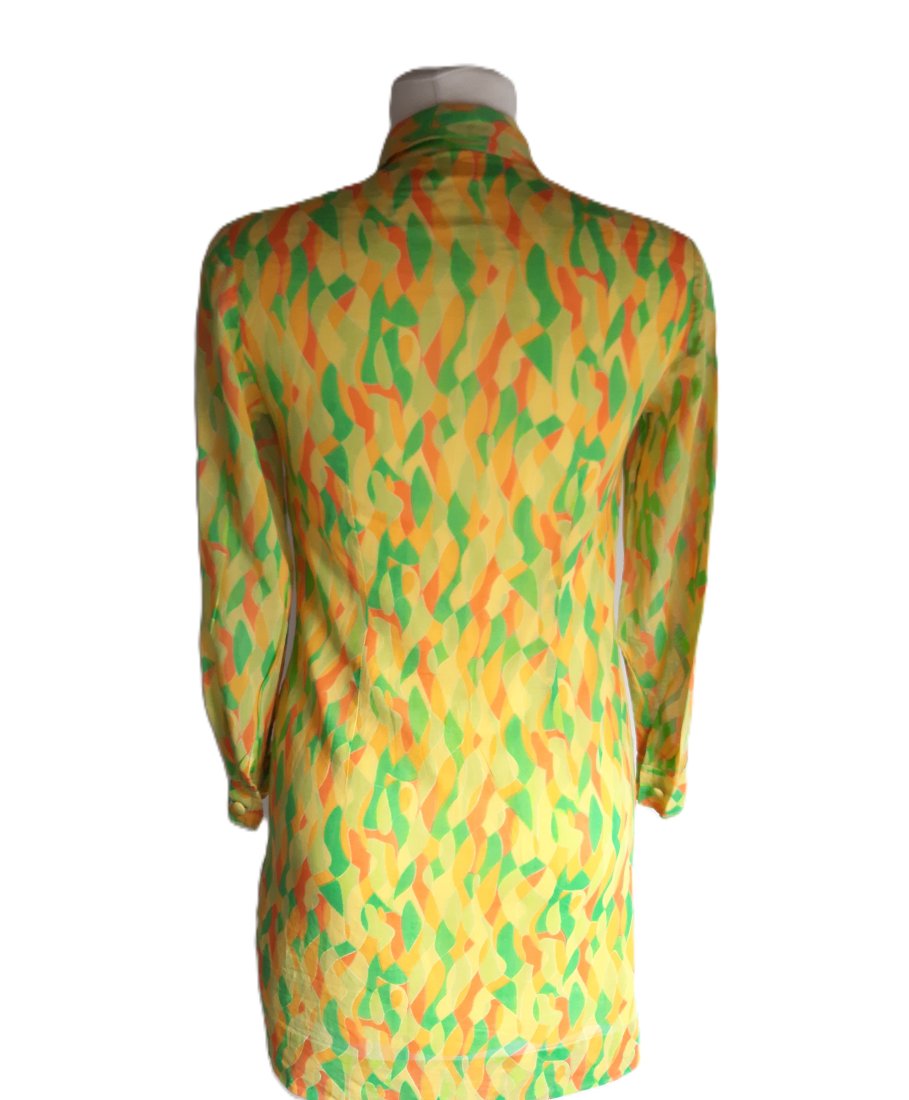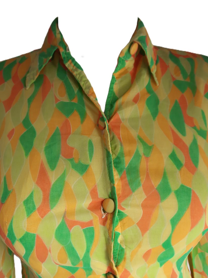 śliczna mini sukienka vintage z lat 60/70-tych w pięknych jasnych kolorach zieleni, pomarańczowego i żółtego (zdjęcia z bardzo bliska przekłamują rzeczywisty kolor sukienki), abstrakcyjne wzory, nieduży kołnierzyk, zapinana z przodu na guziki powlekane materiałem, długi lekko prześwitujący rękaw zakończony mankietem zapinanym na jeden guzik, na podszewce (oprócz rękawów), brak metki ze składem materiału, materiał bardzo cienki, przypominający bawełnę (nie mam pewności)