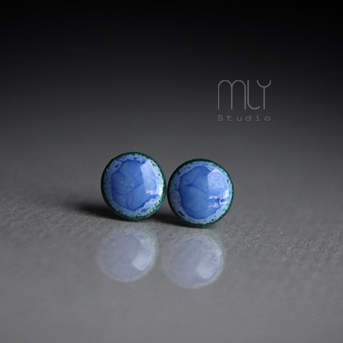 Ceramiczne kolczyki w formie sztyftów, ręcznie wykonane z delikatnej zielonej porcelany, jednostronnie szkliwione mieszanką szkliw w kolorze błękitu i zieleni , z efektem plamek, na antyalergicznych sztyftach w kolorze srebrnym. średnica ok. 6mm.Polecam