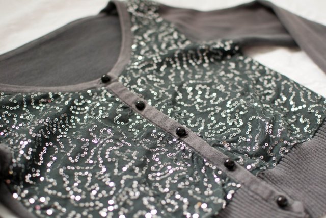 Grafitowy mini sweterek z cekinami. Okrągłe guziczki. Uroczy. Bransoletka ze zdjęcia dostępna w naszej galerii.
