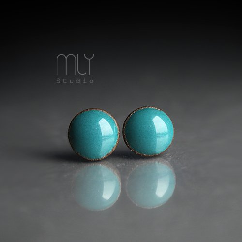 Ceramiczne okrągłe kolczyki w formie sztyftów, ręcznie wykonane z delikatnej gliny kamionkowej jednostronnie szkliwione zielonym szkliwem z efektem plamek i pięknym połyskiem, na antyalergicznych sztyftach w kolorze srebrnym. Średnica ok. 6mm. Polecam . Termin realizacji zamówienia to 1-2 dni.