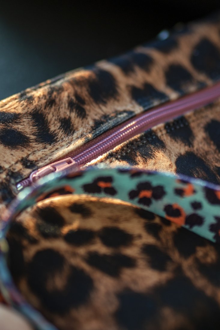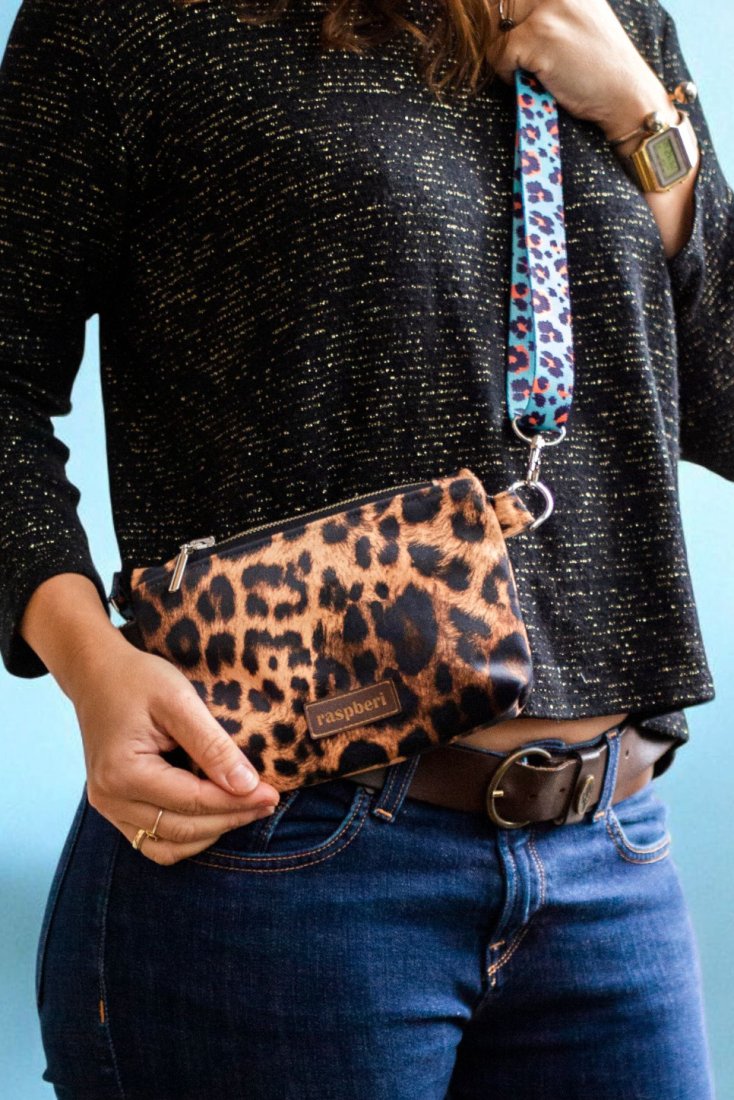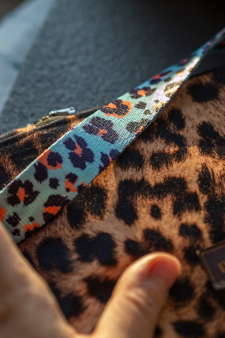 Prosta torebka w rozmiarze mini wykonana z weluru w panterkę.