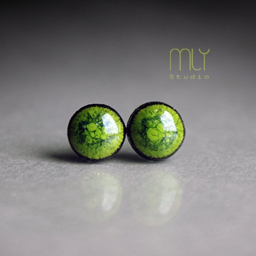 Ceramiczne okrągłe kolczyki w formie sztyftów, ręcznie wykonane z delikatnej gliny kamionkowej jednostronnie szkliwione zielonym szkliwem z efektem plamek i pięknym połyskiem, na antyalergicznych sztyftach w kolorze srebrnym. Średnica ok. 6mm. Polecam . Termin realizacji zamówienia to 1-2 dni.
