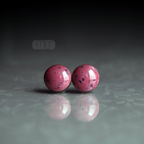 Ceramiczne okrągłe kolczyki w formie sztyftów, ręcznie wykonane z delikatnej gliny kamionkowej jednostronnie szkliwione mieszanką różowych z efektem plamek i subtelnym połyskiem, na antyalergicznych sztyftach w kolorze srebrnym. Średnica ok. 6mm. Polecam . Termin realizacji zamówienia to 1-2 dni.