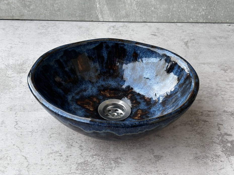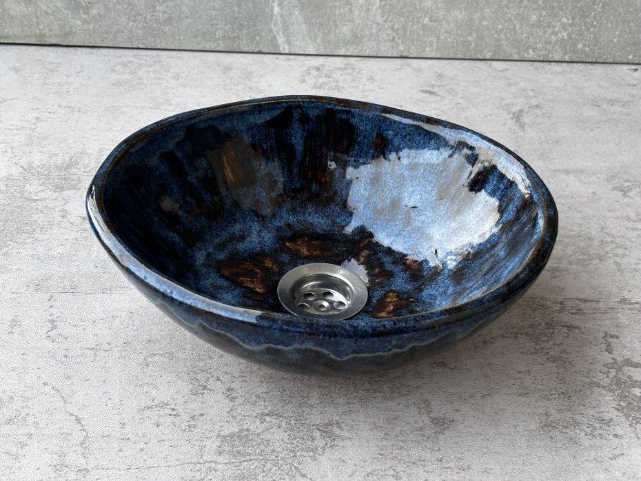 Ręcznie formowana umywalka ceramiczna o gładkiej, zaokrąglonej formie i intensywnie granatowym szkliwie. Jej powierzchnia jest niejednolita( widać pociągnięcia pędzlem) ale błyszcząca i odporna na wilgoć a także detergenty co zapewnia trwałość i łatwość w utrzymaniu czystości.