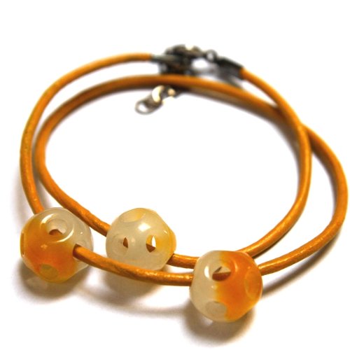 Bransoletka wykonana z dziurawych kuleczek agatu (średnica ok. 12mm) + żółty rzemyk. Wszystko w połączeniu z oksydowanym srebrem. Długość bransoletki regulowana: 35-37cm (do podwójnego owinięcia). Serdecznie polecam.