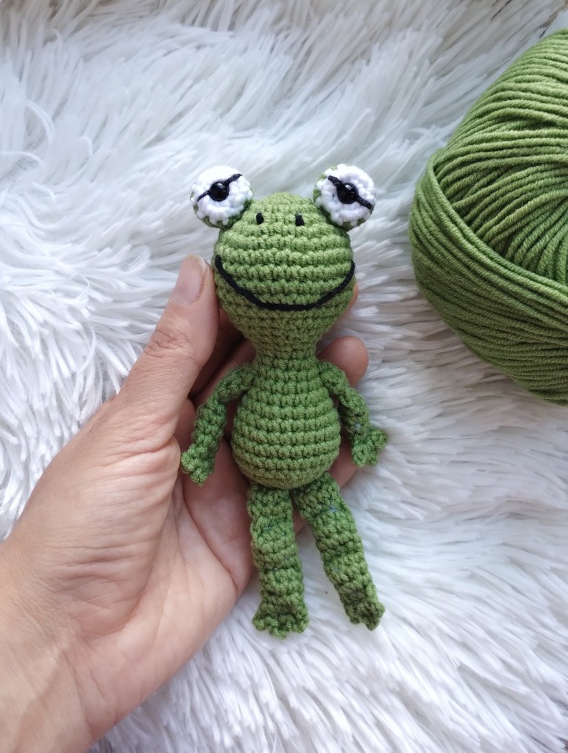 A zabawka to mini żabka. Mini, bo pochodzi z serii namniejszych dzierganych przeze mnie zabawek. Ma ok 14 cm wzrostu,zielone ciałko i wyłupiaste oczyska - jak na żabkę przystało. Będzie doskonałą towarzyszką każdej zabawy, a biorąc pod uwagę jej kieszonkowy rozmiar będzie mogła wyruszyć na każdą wyprawę!
