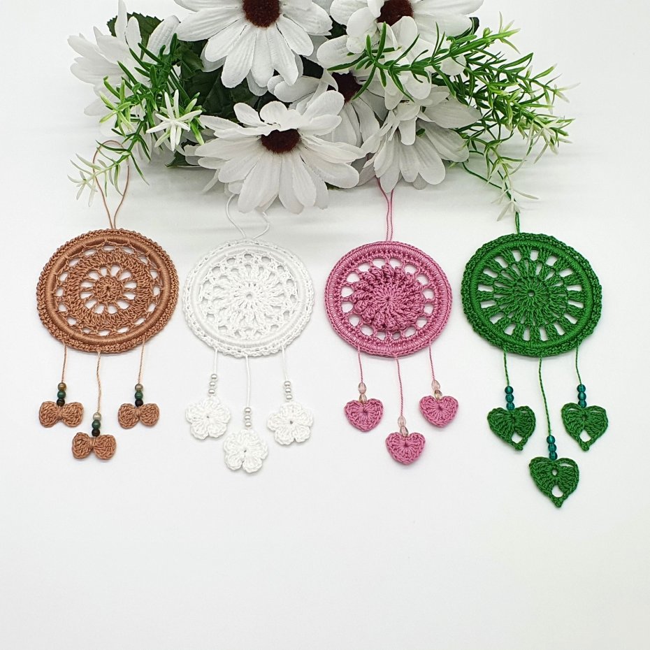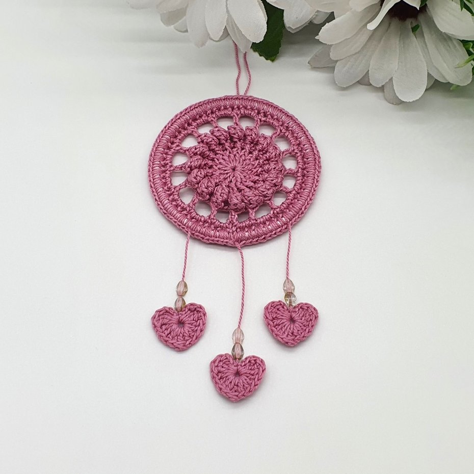 Mini zawieszka w kolorze różowym, wykonana na szydełku, z kordonka, wykończona koralikami i serduszkami. Do samochodu i nie tylko. Średnica 5 cm, długość 12 cm.