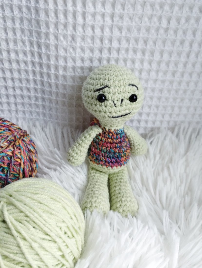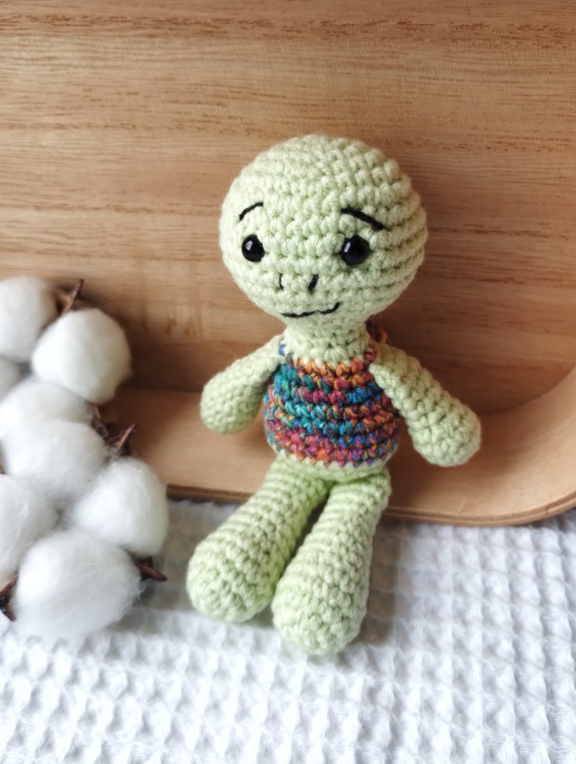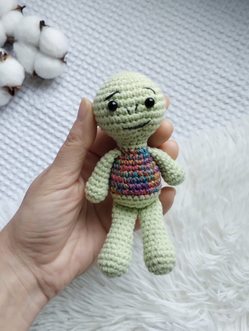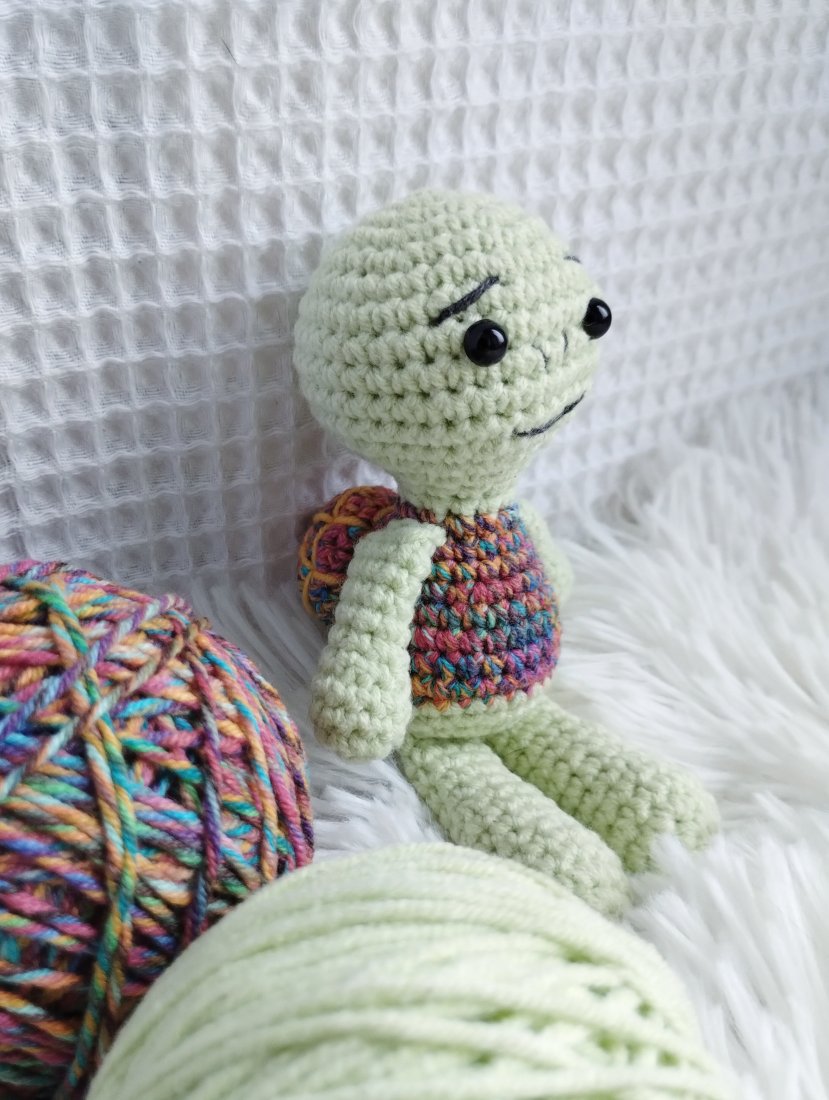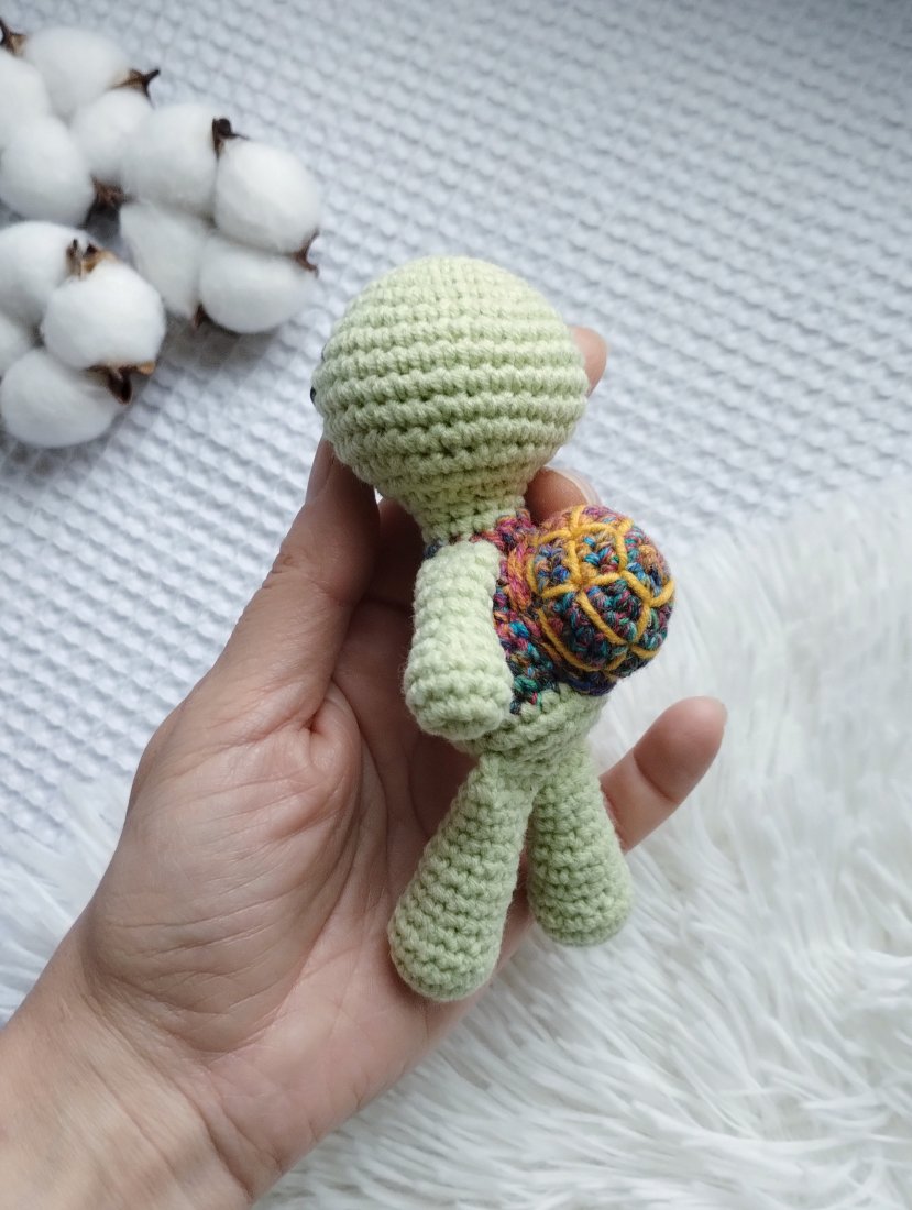 A zabawka to mini żółwik. Mini, bo pochodzi z serii namniejszych dzierganych przeze mnie zabawek. Ma ok 14 cm wzrostu, łysą główkę i skorupkę - jak na żółwika przystało. Będzie doskonałym towarzyszem każdej zabawy, a biorąc pod uwagę jego kieszonkowy rozmiar będzie mógł wyruszyć na każdą wyprawę!