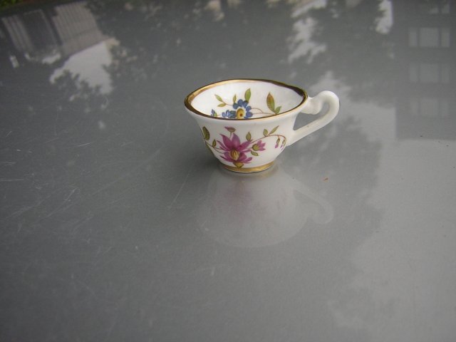 Miniaturowa, porcelanowa filiżanka. Filigranowe cudo, Sygnowane HAMMERSLEY FINE BONE CHINA MADE IN ENGLAND. Klasyczna forma, urocze kwiatowe zdobienie. Biała porcelana na błyszcząco szkliwiona. Rant złocony. Kolory zdobienia wyraziste, źywe, radosne .