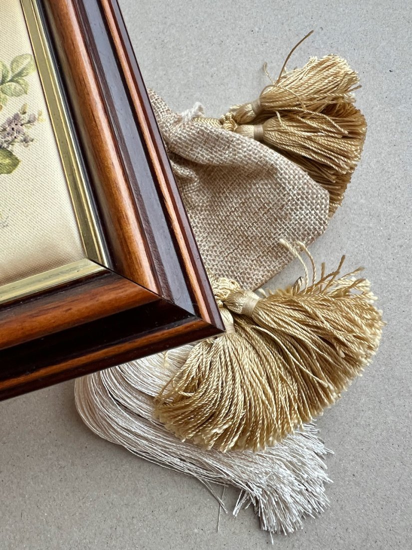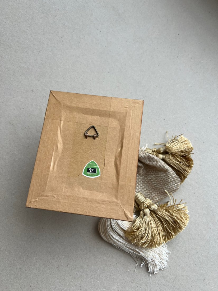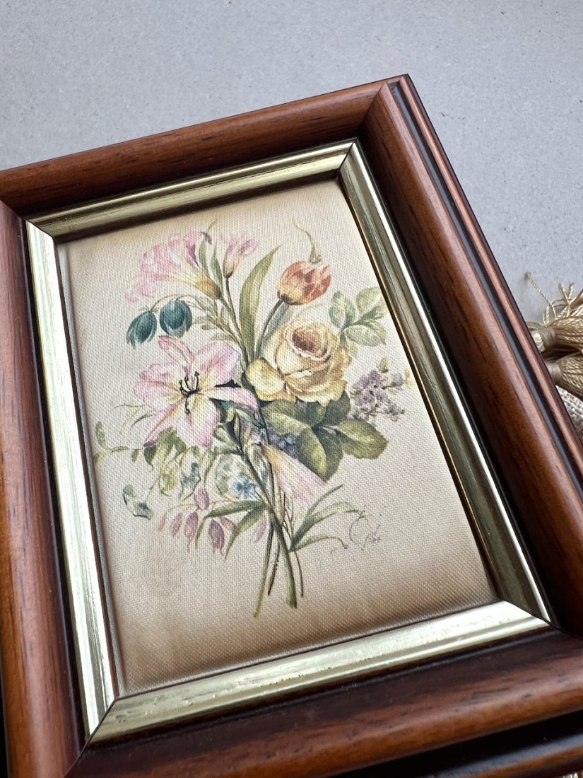 Wymiary ramki 13,5cm x 11cm. Część jedwabna 8,5x6cm. Stan wręcz idealny(jak na przedmiot nie nowy), czysty bez uszkodzeń.