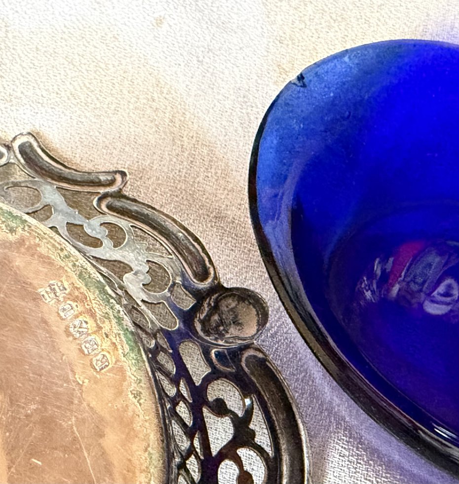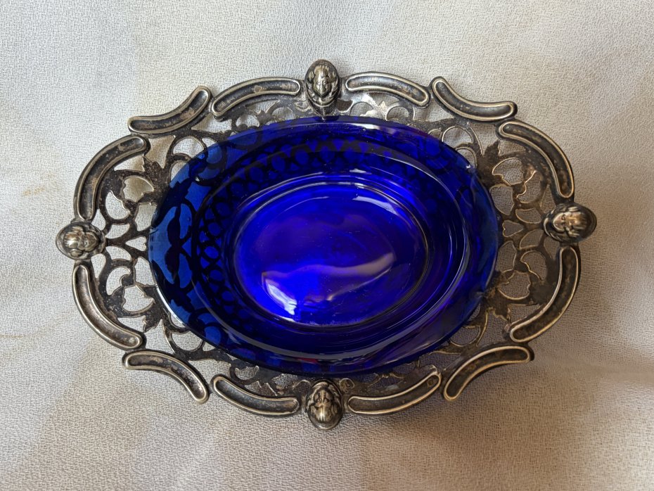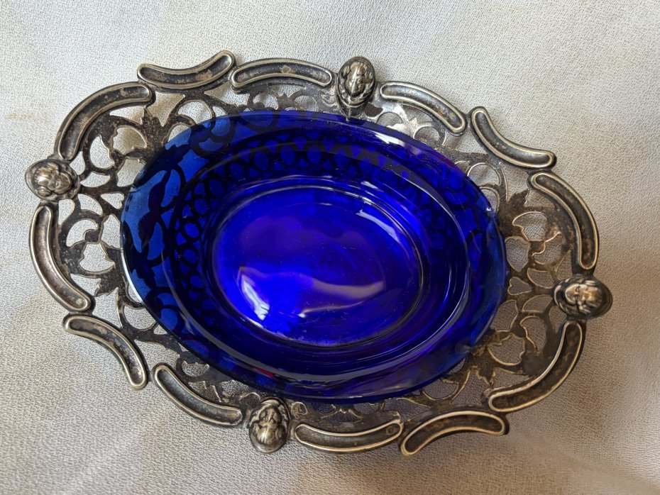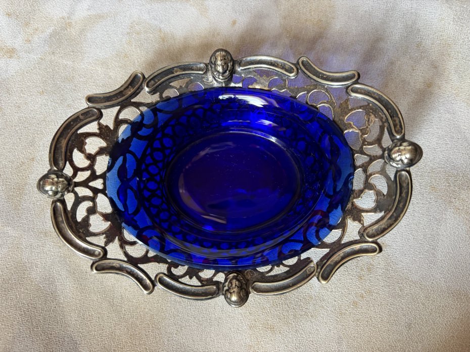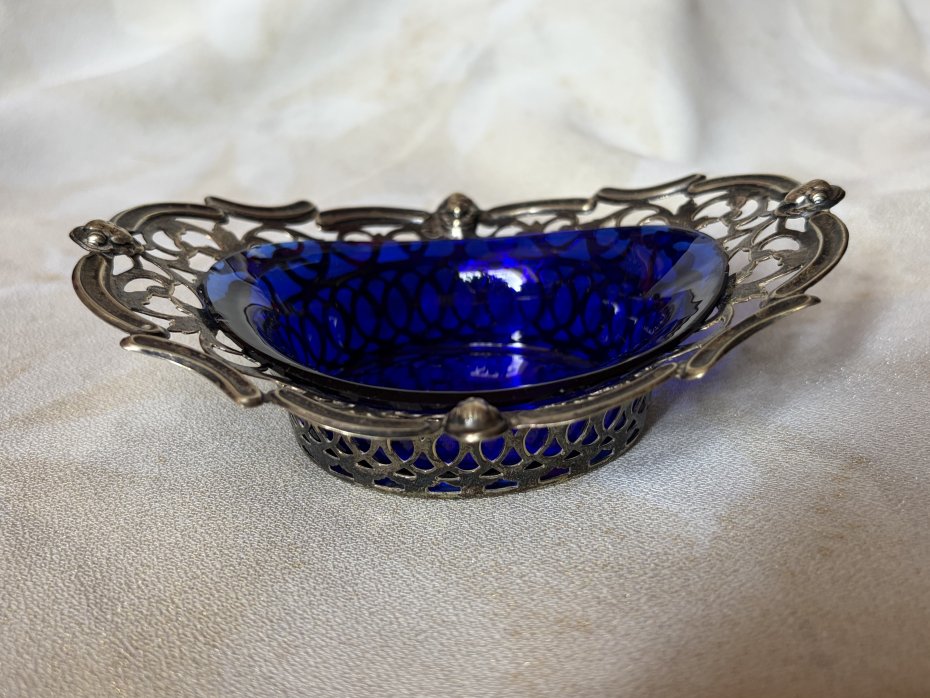 Rzadkość na rynku polskim - Miniaturowa , ażurowa paterka platerowana ze szkłem kobaltowym . Sygnowana , srebrzona , niespotykana . Użytkowa ze szkłem i bez . Paterka ; góra 13,5 x 10 dol 6,5 x 5,5 wysokosc 4,5/3. Cm Dzklo kobaltowe : góra prawie 9,5 x trochę ponad 7 dol 6 x 5 wys . 3,5 / prawie 2,5 cm cm Stan zachowania dobry . Drobne ślady czasu i użytkowania ( starałam się pokazać na zdjęciu - Uwaga !!! Nie czyszczę srebra i platerów specjalnie do sprzedaży .