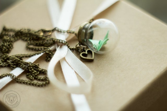 Delikatny, maleńki, papierowy żuraw - japoński symbol szczęścia, zdrowia i pokoju. Podobno, jeśli w jakiejś intencji złoży się tysiąc żurawich figurek, to życzenie się spełni. My spełniamy życzenia tym zjawiskowym wisiorkiem. Papierowy żuraw ukryty w szklanej kuleczce o najszerszej średnicy 2 cm. Część ozdobna zawieszona na łańcuszku o długości 35 cm. Całość w kolorze brązu/starego złota.