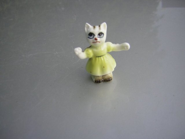 Miniaturowa porcelanowa figurka. Nie sygnowana. Urocza kicia w żywych, radosnych barwach, wykończenie błyszczące. Pusta w środku z dziurką od spodu. Do kolekcji i na prezent.