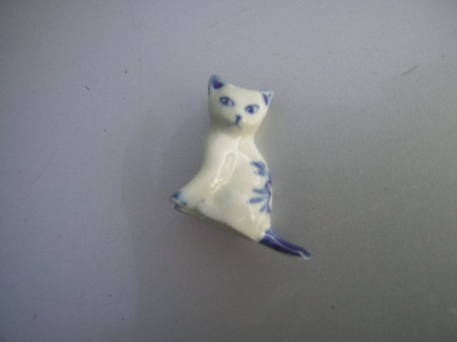 Miniaturowa porcelanowa figurka. Nie sygnowana. Urocza kicia ręcznie malowana , w Niuansach niebieskości i błyszczącym wykończeniu.. Pusta w środku z dziurką od spodu. Do kolekcji i na prezent.
