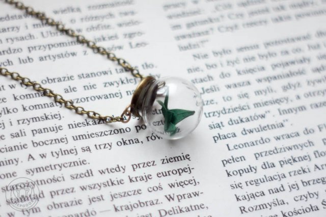 Delikatny, maleńki, papierowy żuraw - japoński symbol szczęścia, zdrowia i pokoju. Podobno, jeśli w jakiejś intencji złoży się tysiąc żurawich figurek, to życzenie się spełni. My spełniamy życzenia tym zjawiskowym wisiorkiem. Papierowy żuraw ukryty w szklanej kuleczce o najszerszej średnicy 2 cm. Część ozdobna zawieszona na łańcuszku o długości 36 cm. Całość w kolorze starego złota/brązu.