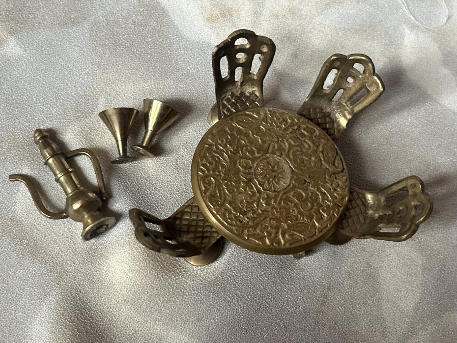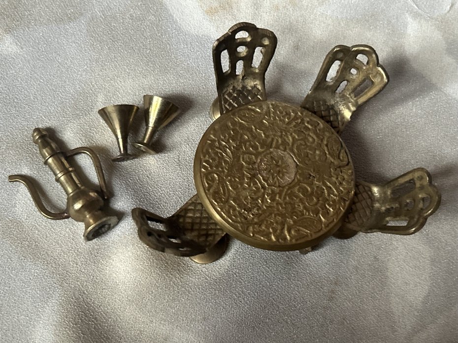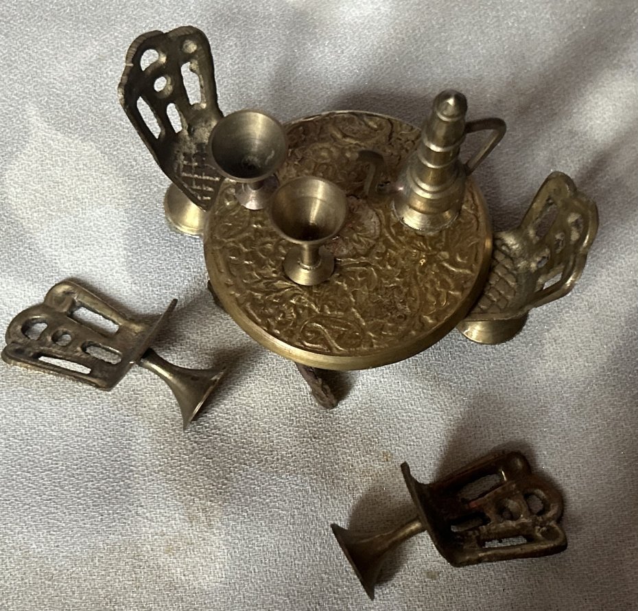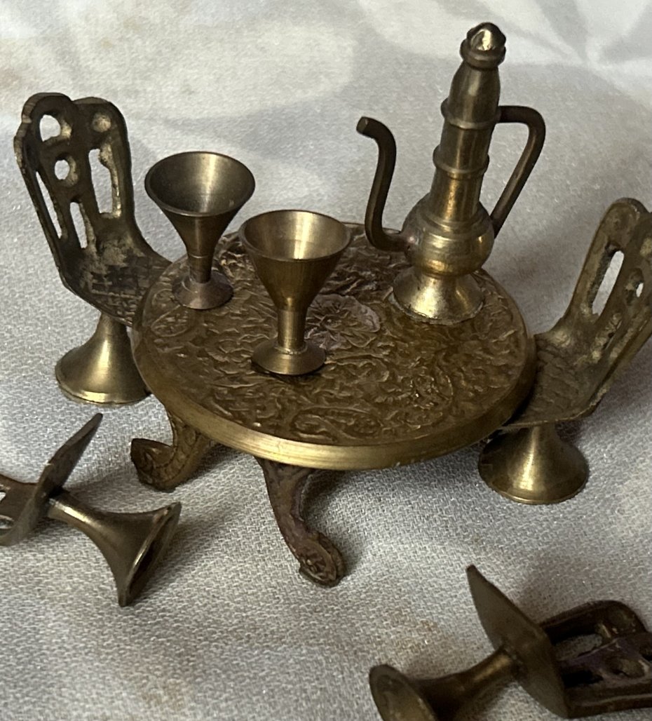 Zestaw ręcznie wykonanych miniaturowych mebelków z mosiądzu. Jako pełny zestaw rzadko spotykane. Z założenia do domku dla łatek , ale są zarówno kolekcjonerskie jak też dekoracyjne . Zestaw składa się ze stołu , czterech krzesełek, dzbanka i dwóch kielichów . . Bardzo dobrze wykonane . Stolik / średnica trochę ponad 6 cm wysokość 2,5 cm fotelik - podstawa trochę ponadnarodowa 1,5 cm szerokość oparcia 2,5 cm wysokość całkowita trochę więcej niż 4,5 cm dzbanek szerokość 3,5 wysokość 5 kielich góra około 1, cm podstawa 1 cm wysokość 2 cm . Stan zachowania bardzo dobry .