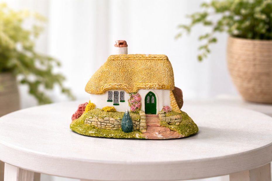 Urocza figurka przedstawiająca miniaturowy domek z strzechą, inspirowany sielskim klimatem wsi. Domek posiada wiele drobnych detali: kamienny płotek, ścieżkę prowadzącą do zielonych drzwi oraz kwiaty wokół domu, co nadaje mu wyjątkowego, bajkowego charakteru.