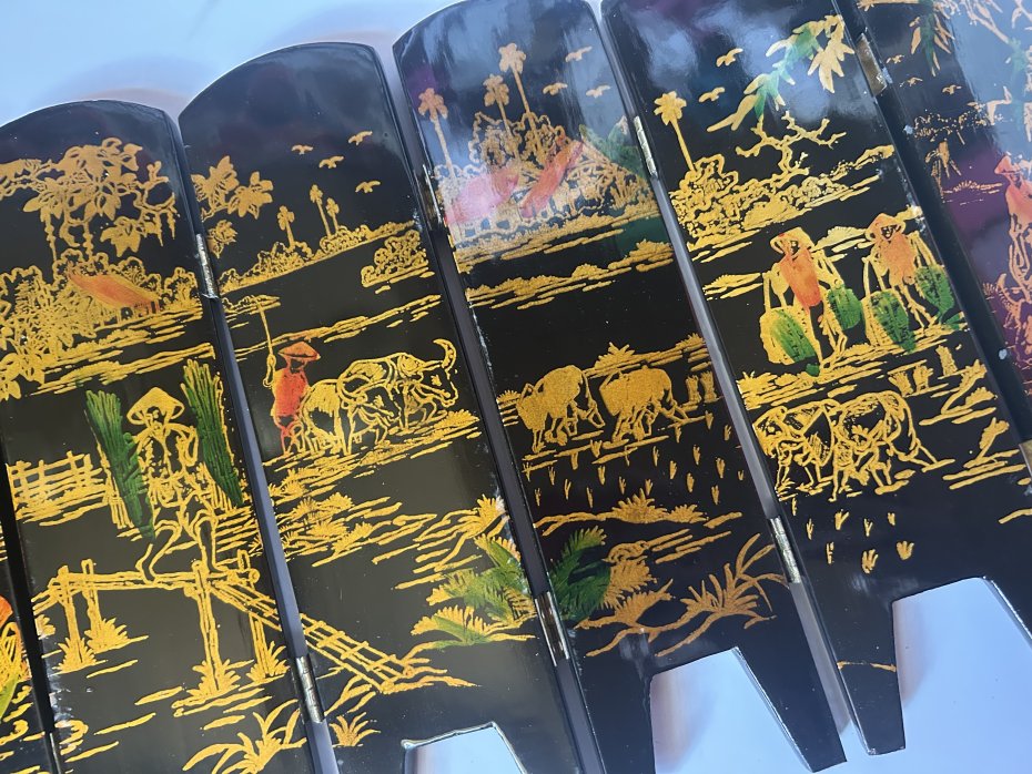 Miniaturowy orientalny parawan . Oryginał z lat 50-ych - drewno pokryte laką - Chiny . Dwustronny . Z jednej strony motywy figuratywne - ręcznie malowane i inkrustowane masą perłową postacie kobiet , z drugiej malatura ze scenką z codziennego życia . Żywe barwy , wykończenie satynowo błyszczące . Inkrustacje lekko wyczuwalne pod dłonią . Szerokość całkowita 41,5 wysokość 25 cm pojedynczy panel ( 1 z 6) szerokość 6,5 cm Łączenie na zawiaski . Stan zachowania - drobne ślady użytkowania. Ogólny dobry .
