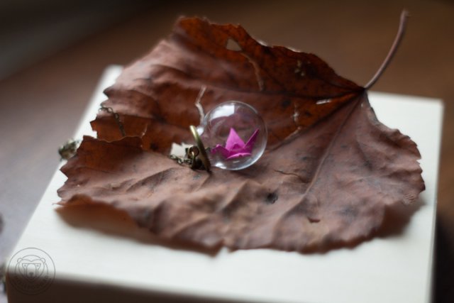 Delikatny, maleńki, papierowy żuraw - japoński symbol szczęścia, zdrowia i pokoju. Podobno, jeśli w jakiejś intencji złoży się tysiąc żurawich figurek, to życzenie się spełni. My spełniamy życzenia tym zjawiskowym wisiorkiem. Papierowy żuraw ukryty w szklanej kuleczce o najszerszej średnicy 2 cm. Część ozdobna zawieszona na łańcuszku o długości 36 cm. Całość w kolorze starego złota.