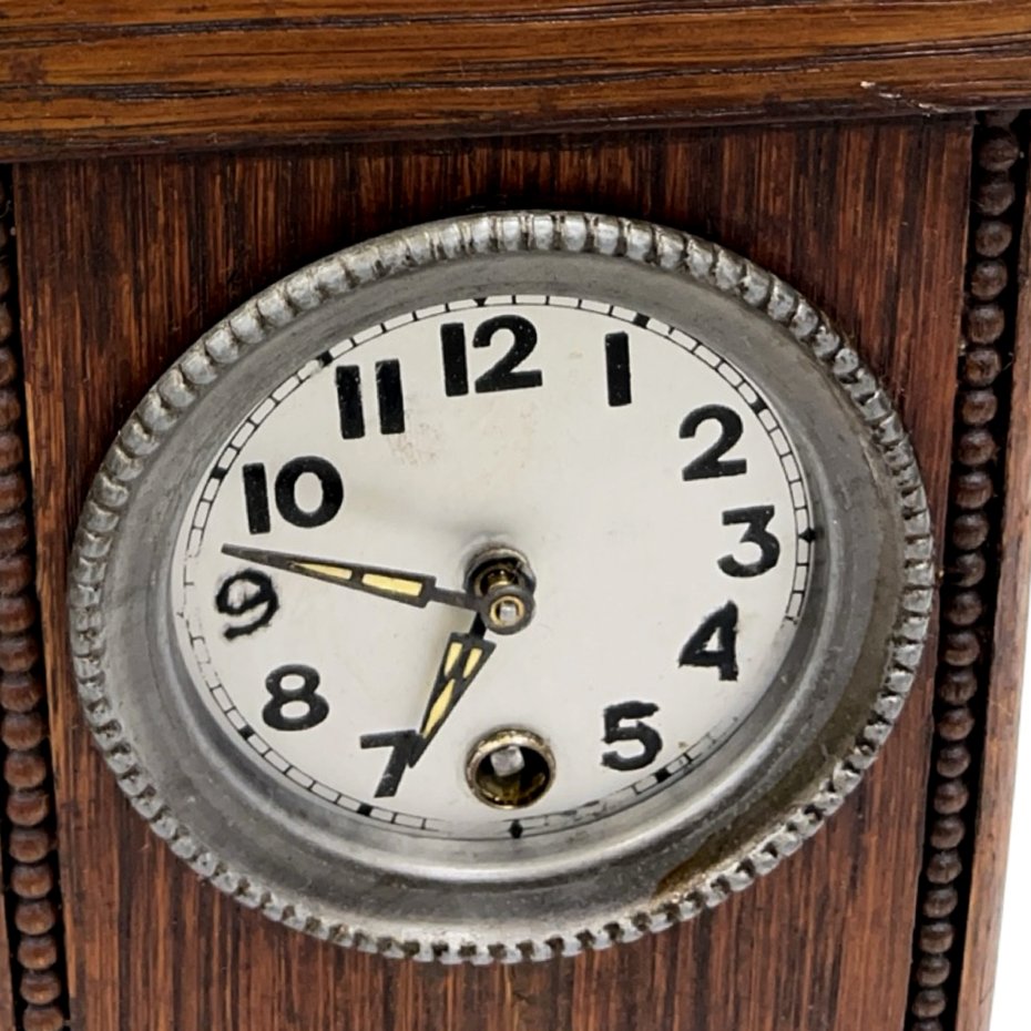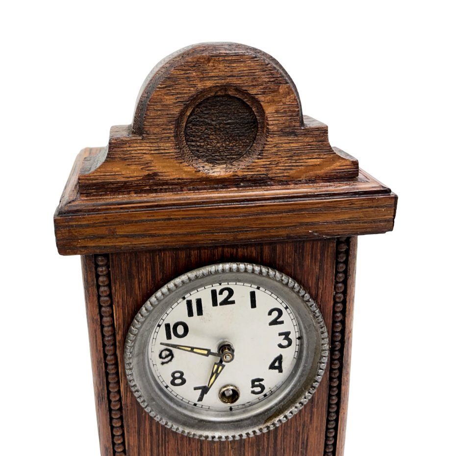 Miniaturowy zegar kominkowy — drewno dębowe w ciemnym wybarwieniu, emaliowana tarcza z czarnymi cyframi arabskimi, obudowa metalowa tarczy niklowana, metalowe wskazówki. Obudowa w formie miniaturowej wieży zegarowej z profilowanym zwieńczeniem arkadowym i otworami resonansowymi, zdobiona rowkowanymi listwami po bokach. Niższy korpus ze szklaną przeszkloną przednią ścianką odsłaniającą ośmiokątne wahadło. Mechanizm nakręcany kluczykiem (z kluczykiem), sprawny. Wymiary: 26 × 13 × 9 cm. Niemcy, lata 20. XX w. Stan dobry.