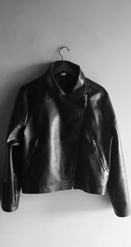 Jak nowa czarna ramoneska z bardzo fajnej eko skóry stan idealny rozmiar z metki 46 ale w realu mniejszy długość 55 pod pachami 57x2 max dół 54x2