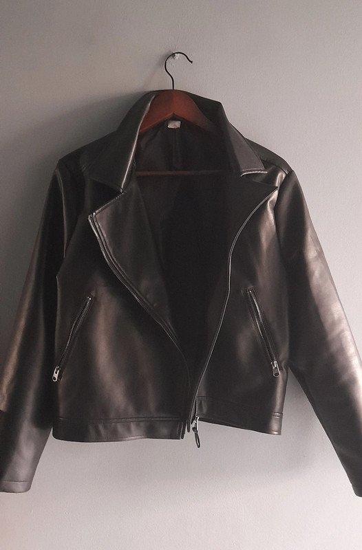 Jak nowa czarna ramoneska z bardzo fajnej eko skóry stan idealny rozmiar z metki 46 ale w realu mniejszy długość 55 pod pachami 57x2 max dół 54x2