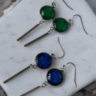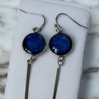 Jak kropla nieba w srebrnej ramie – kolczyki z pręcikiem w kolorze srebrnym i błękitnym oczkiem zachwycają prostotą i lekkością formy.