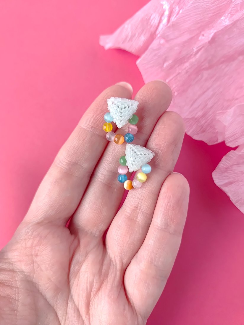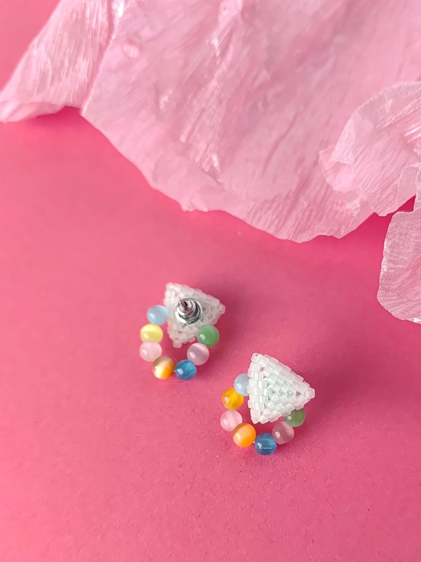 Małe, lekkie i pełne uroku. Białe trójkąciki z kolorowym akcentem – trochę jak koralikowe konfetti. Każdy zrobiony ręcznie, z dbałością o detale. Na sztyftach, więc bardzo wygodne i idealne do noszenia na co dzień.
