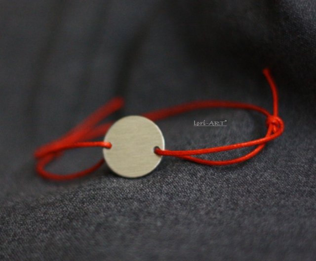 Minimalistyczna urocza bransoletka wykonana z satynowanej tarczy z aluminium (ok.18 mm) oraz woskowanego sznurka . Biżuterie wysyłam w ozdobnym bezpiecznym opakowaniu .