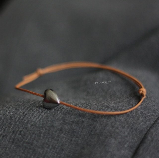 Minimalistyczna bransoletka wykonana z pięknego platerowanego srebrnego hematytu -serce (10mm) oraz naturalnego rzemyczka . Biżuterie wysyłam w ozdobnym bezpiecznym opakowaniu .