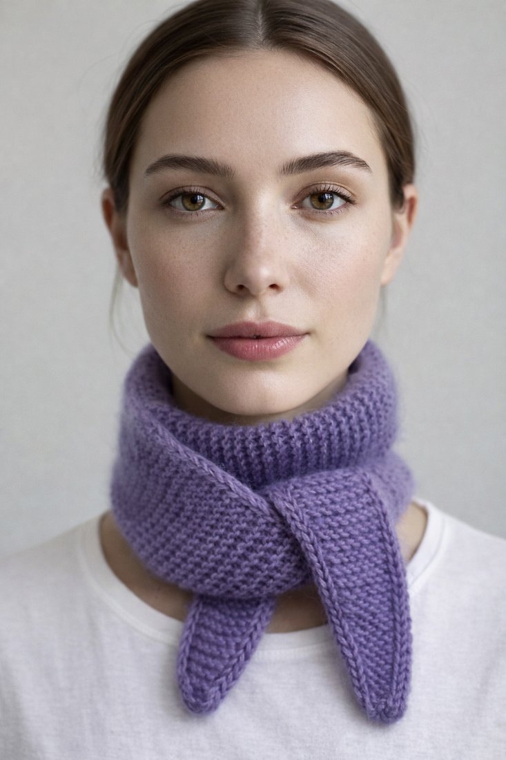 Krótki szalik wiązany to minimalistyczny dodatek pasujący do płaszcza, kurtki, grubego swetra czy sukienki. Sprawdza się jesienią, zimą i nawet wiosną.