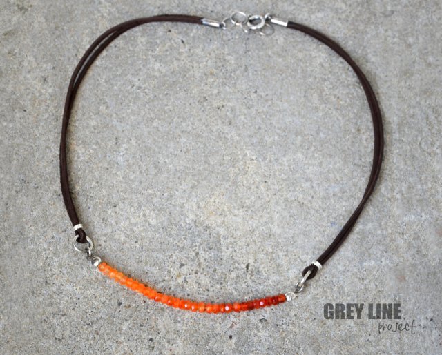 Prosty, minimalistyczny naszyjnik wykonany z brązowego rzemienia oraz oponek naturalnego cieniowanego karneolu. Całość została ujęta w srebro próby 925, oksydowane i przecierane.