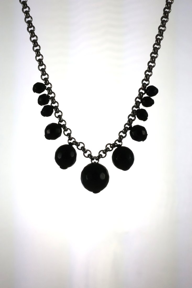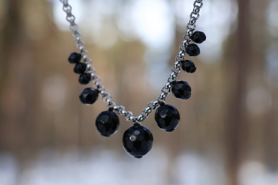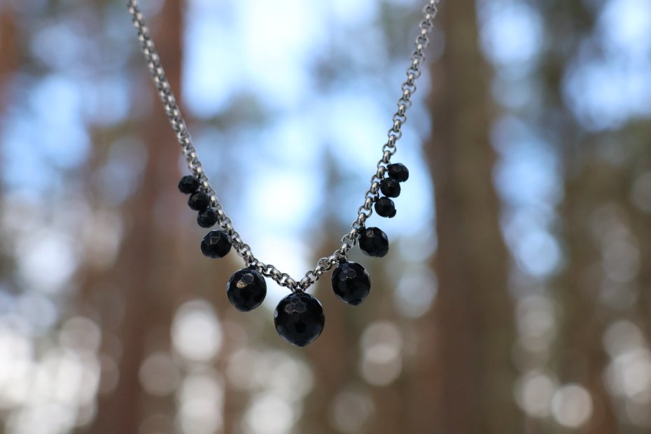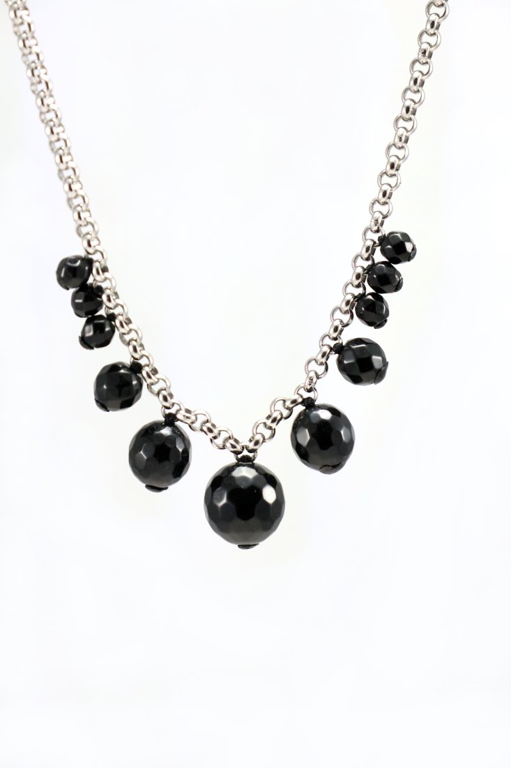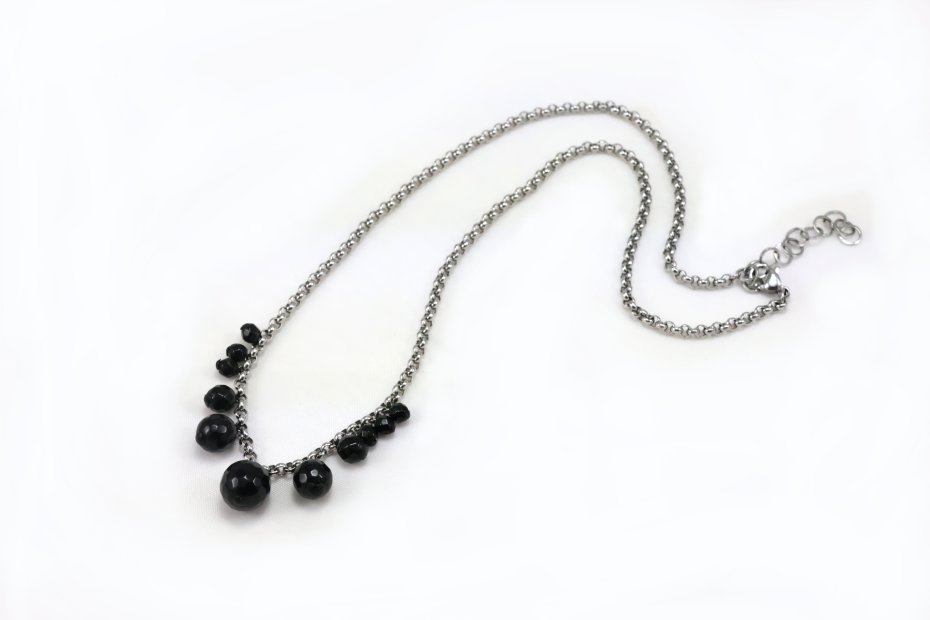Subtelny, nowoczesny i delikatny naszyjnik. Połączenie błyszczących, czarnych onyksów o różnej wielkości z drobnym srebrzystym łańcuszkiem. tTen naszyjnik to uniwersalny dodatek, który pasuje do każdej okazji.