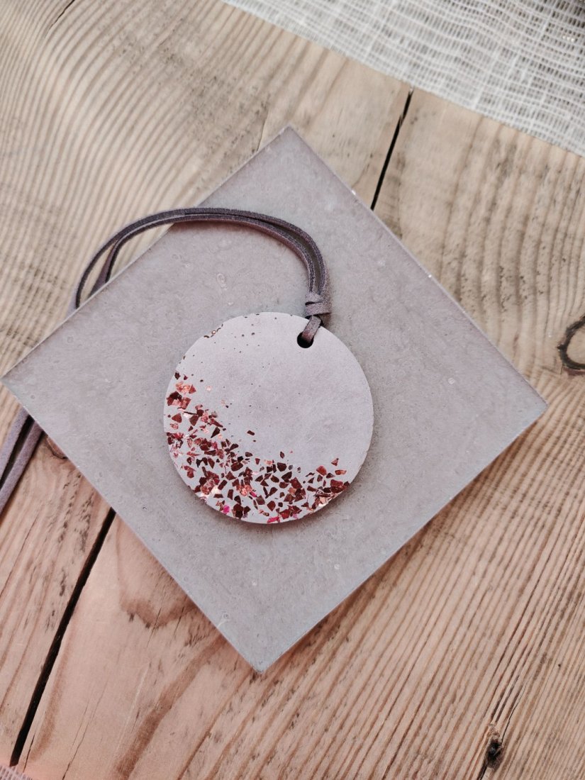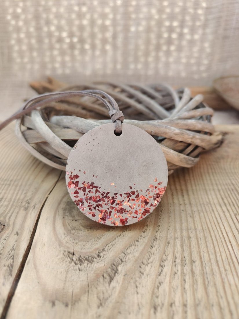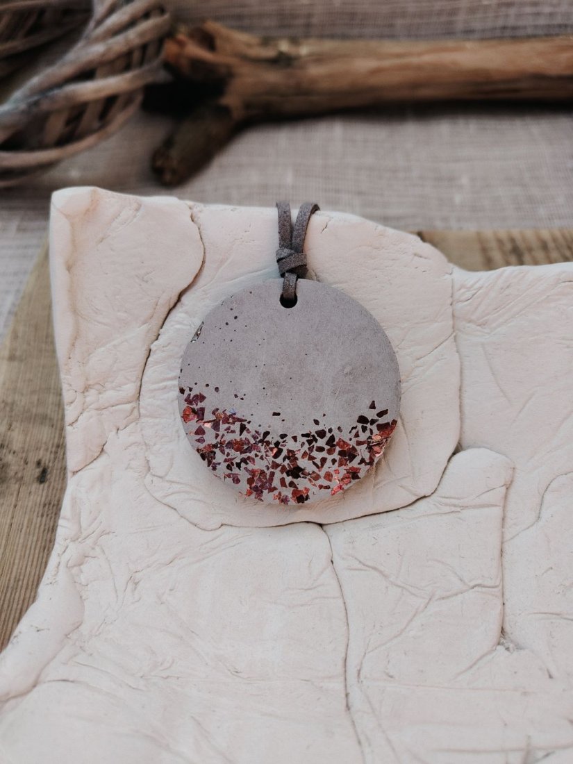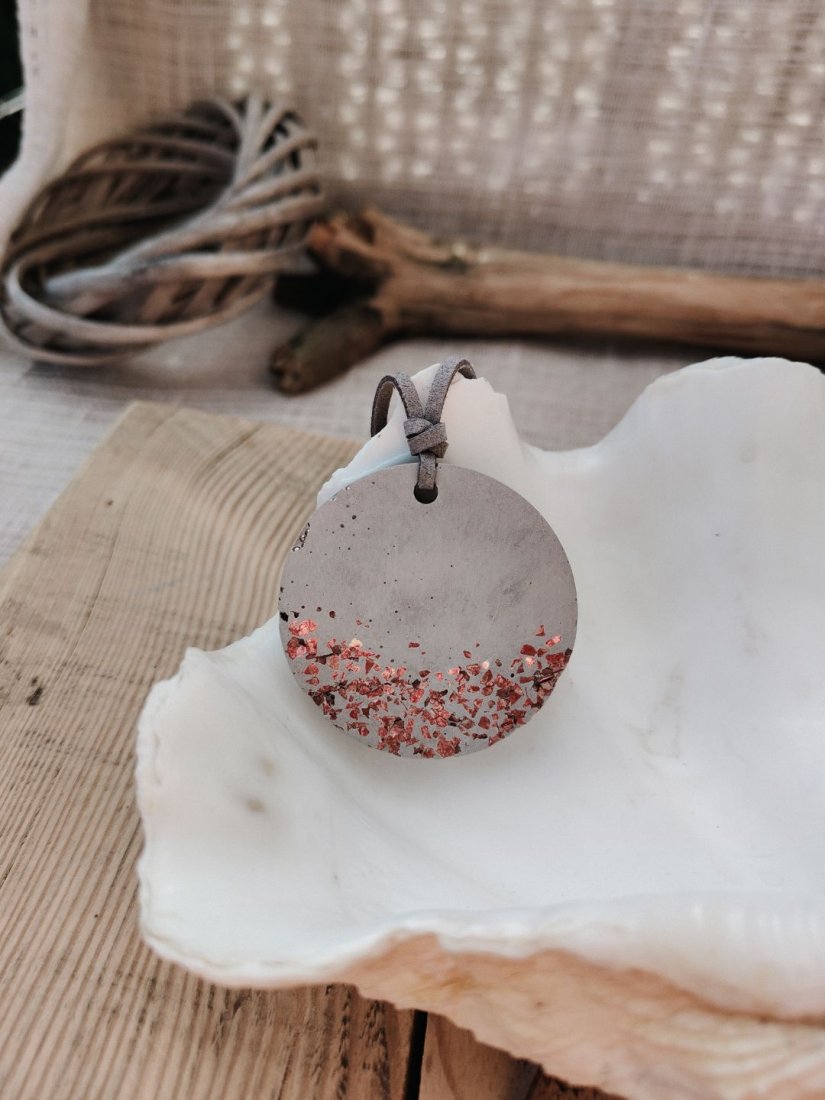 Wyjątkowy wisior wykonany z betonu to propozycja dla osób ceniących nowoczesny design i nieoczywiste materiały. Surowa, matowa powierzchnia została przełamana subtelnym, miedzianym akcentem, który dodaje całości charakteru i przyciąga wzrok. Zawieszony na rzemieniu z możliwością regulacji długości, doskonale dopasowuje się do różnych stylizacji – od codziennych po bardziej wyraziste. To biżuteria, która podkreśla indywidualność i wyróżnia się na tle klasycznych dodatków.