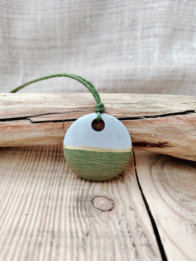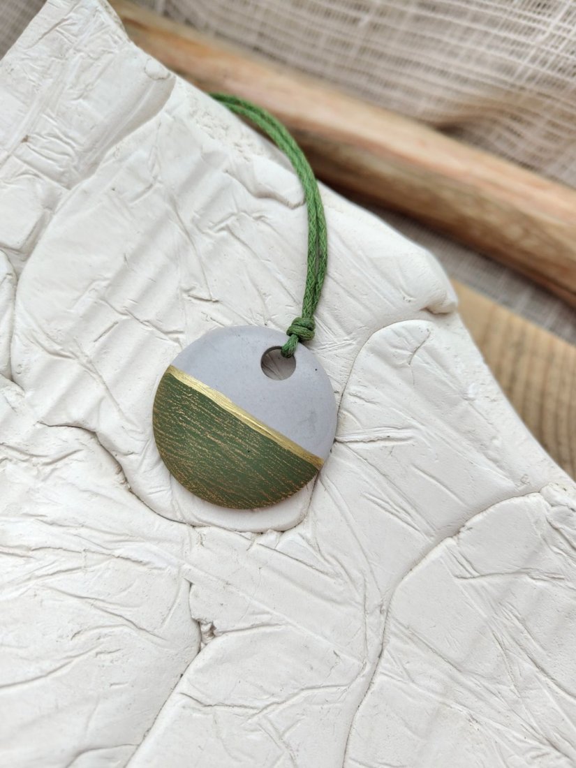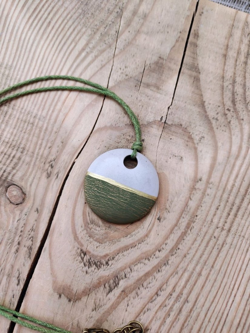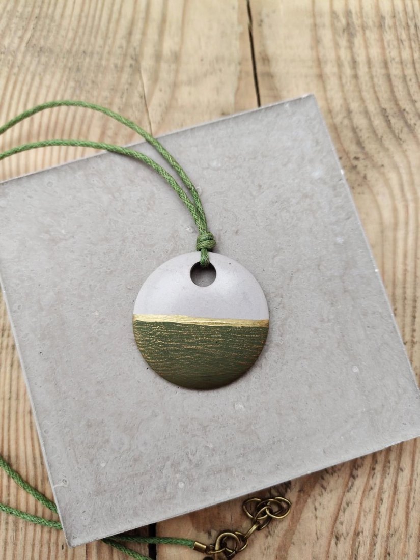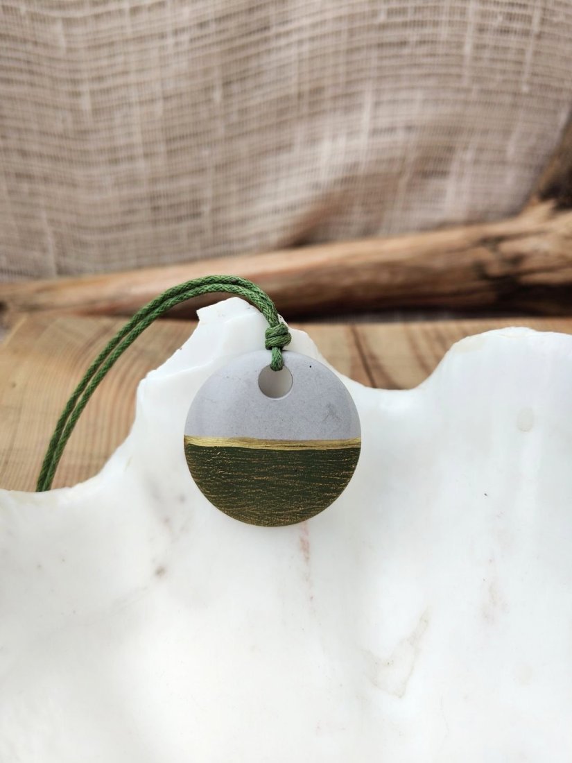 Unikatowy wisiorek wykonany ręcznie z betonu kreatywnego, łączący surową estetykę z delikatnym, naturalnym akcentem kolorystycznym. Okrągła forma została ozdobiona subtelnym przejściem barw – od jasnej, neutralnej góry po zielony dół z delikatną strukturą. Całość zawieszona jest na wytrzymałym, zielonym sznurku, który podkreśla naturalny charakter biżuterii. Wisiorek posiada wygodne zapięcie na karabińczyk oraz przedłużający łańcuszek, co umożliwia regulację długości.