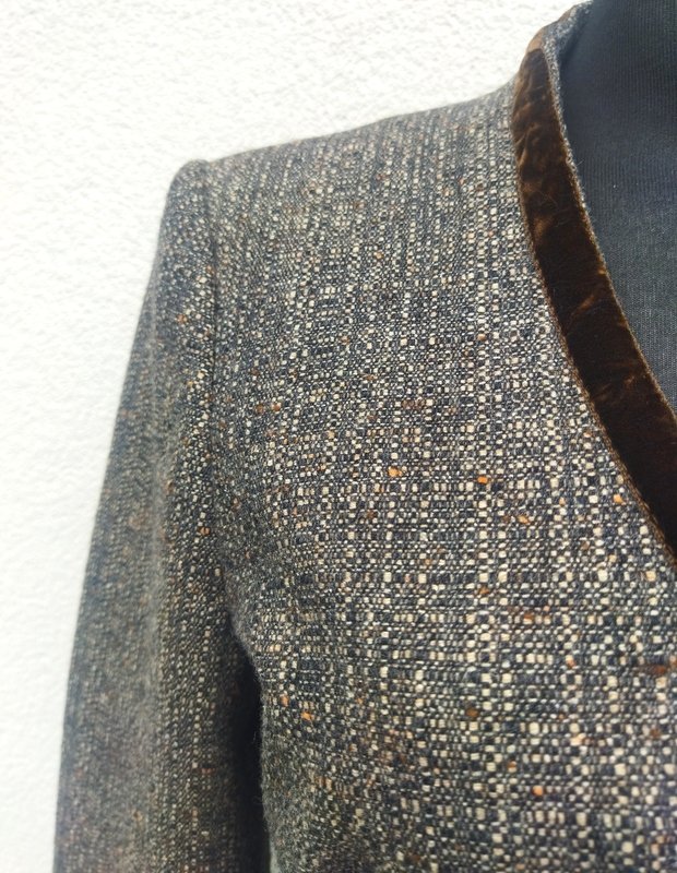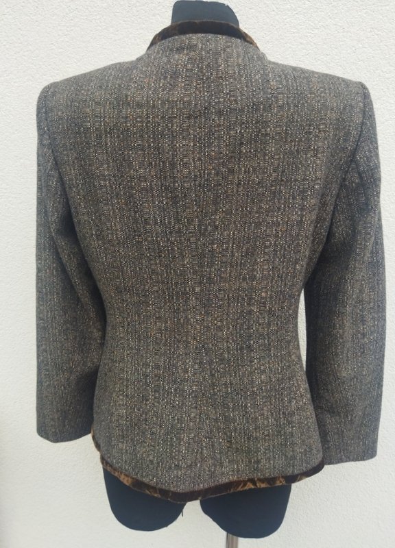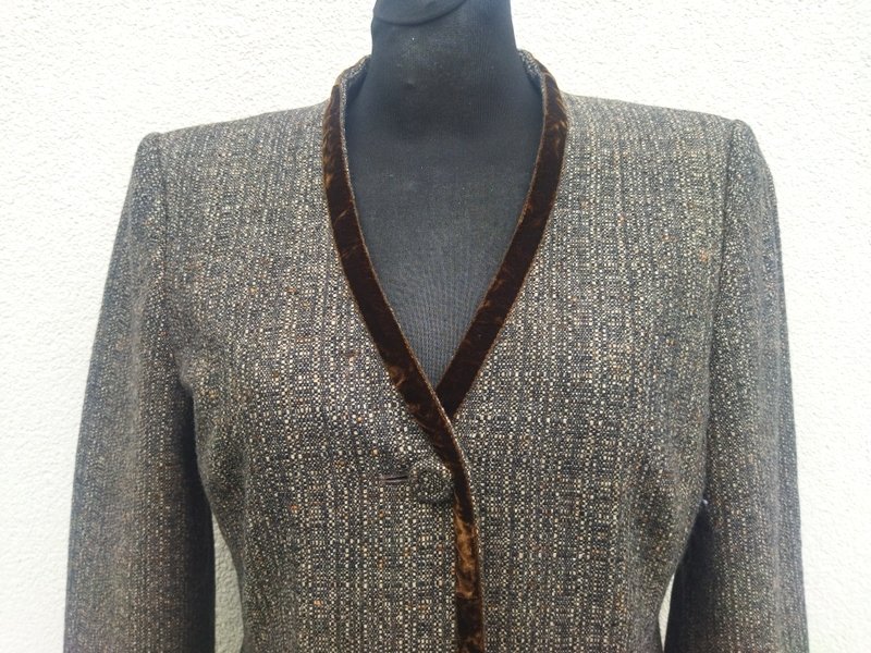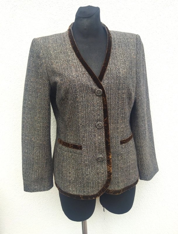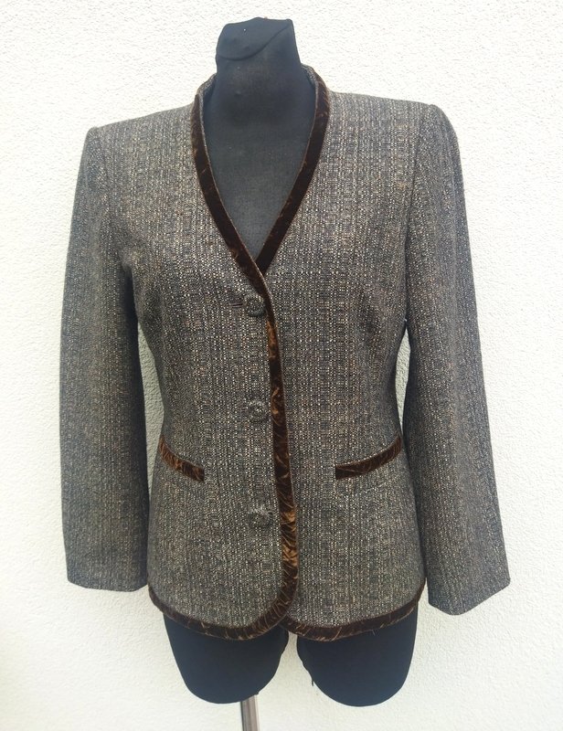 Marynarka z tkaniny o dobrym składzie jakościowym z przewagą wełny i jedwabiu w składzie w melanżowej kolorystyce odcieni brązów i beżu oraz śladowej ilości pomarańczu, wykończona aksamitnymi brązowymi lamówkami. Taliowana , bez kołnierza, z dekoltem w szpic, z dwiema wpuszczanymi kieszeniami, Zapinana na oblekane tkanina guziki. całość na podszewce