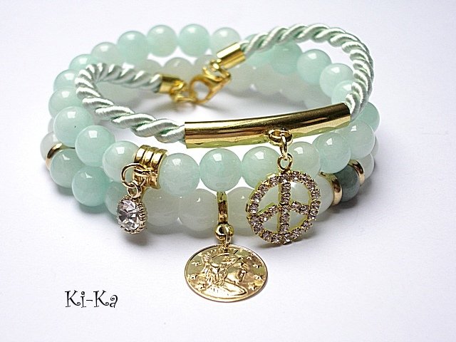 Komplet trzech bransoletek wykonanych z naturalnych minerałów: jadeity [8mm], satynowego sznurka, przywieszek wysadzanych kryształkami oraz elementów metalowych w kolorze złotym. Bransoletki pasują na nadgarstek 16-17cm. Biżuteria ozdobnie zapakowana.