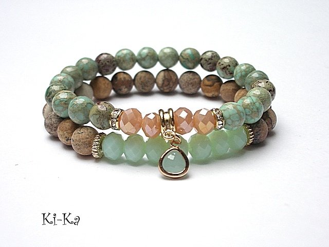 Komplet dwóch bransoletek wykonanych z naturalnych kamieni - jaspisy [8mm], kryształków fasetowanych [6 x 8mm], efektownej zawieszki ze szkła oraz elementów metalowych w kolorze tzw. różowego złota Bransoletki na gumce silikonowej. Pasują na nadgarstek 16-17cm. W przypadku zmiany rozmiaru bransoletek prosimy o wcześniejszy kontakt. Biżuteria ozdobnie zapakowana.