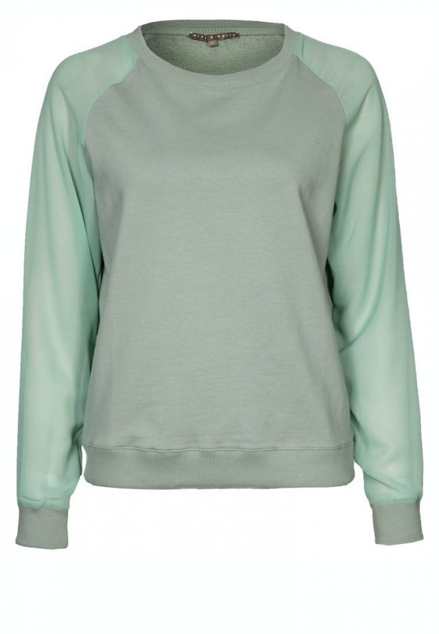 Materiał bluzki jest grubszy a rękawy tiulowe.