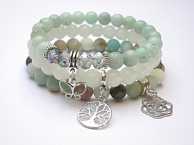 Komplet trzech bransoletek wykonany z kamieni naturalnych - jadeity w kolorze jasnej mięty [8mm] , amazonity matowe [8mm] , amazonity błyszczącei [8mm], kryształków [6 x 8mm] oraz elementów w kolorze srebra. Pasują na nadgarstek 15 -16,5cm. Bransoletki z kamieni na gumce silikonowej. Biżuteria ozdobnie zapakowana