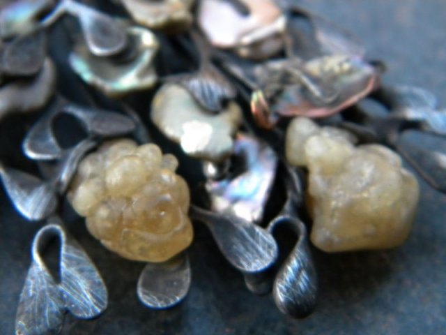 Naszyjnik kalcytów i pereł w ocynowanej miedzi. wymiary zawieszki 6,6cm x 5,4cm. łańcuszek z posrebrzanej, oksydowanej miedzi z zapięciem z oksydowanego srebra o długości 49cm