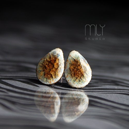 Ceramiczne, lekko nieregularne kolczyki w formie sztyftów, ręcznie wykonane z delikatnej gliny kamionkowej, jednostronnie szkliwione efektownym kremowo brązowym szkliwem z efektem spękań i pięknym połyskiem, na antyalergicznych sztyftach w kolorze srebrnym.Średnica ok. 13mm. Polecam