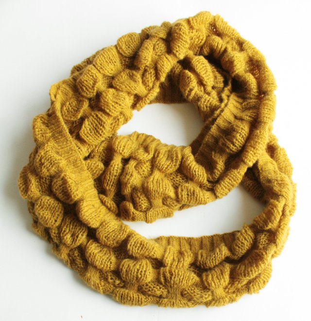 Duży, miękki komin w niebanalny odcieniu miodowo-oliwkowym. Kolor jest stonowany i ciepły.